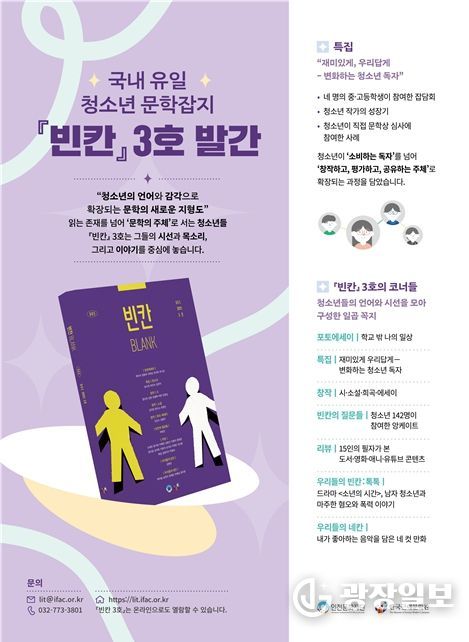 광장일보 주재영 기자 | 인천문화재단 한국근대문학관은 국내 유일의 청소년 문학잡지 [빈칸] 3호를 발간했다.