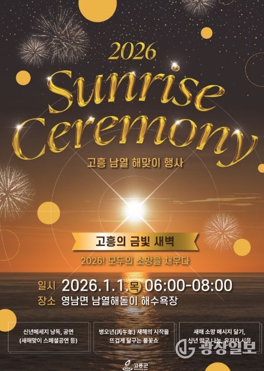 군 관광정책실 관계자는 “2026년 새해를 여는 첫 순간을 함께하며 모두의 소망과 행복을 기원하는 뜻깊은 자리가 될 것”이라며 “간소하지만, 품격 있는 행사로 고흥의 따뜻한 공동체 정신을 보여주겠다”고 말했다.
