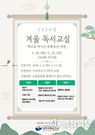 광장일보 이현나 기자 | 삼척교육문화관은 1월 20일부터 1월 22일까지 초등3~5학년을 대상으로 ‘2026년 겨울 독서교실: 책으로 떠나는 문화유산 여행’을 운영한다고 밝혔다.