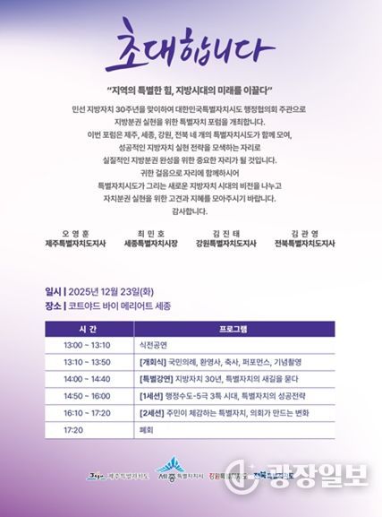 광장일보 이현나 기자 | 강원특별자치도는 12월 23일 코트야드 바이 메리어트 세종에서 강원, 제주, 세종, 전북 4개 특별자치시도지사들이 모여 대한민국특별자치시도 행정협의회 두 번째 정기회의를 개최했다.