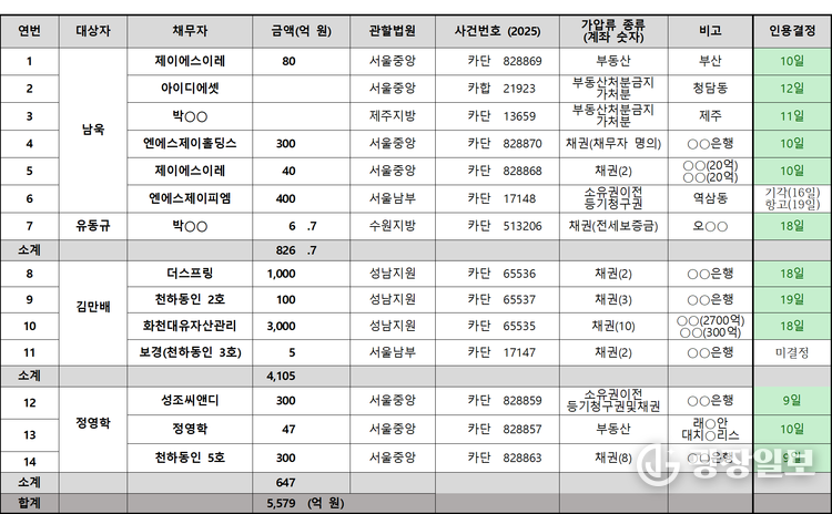 인용된 가압류 내역은 ▲김만배 3건 4,100억 원 ▲남욱 가처분 2건·가압류 3건 420억 원 ▲정영학 3건 646억 9천만 원 ▲유동규 1건 6억 7천만 원 등이다.