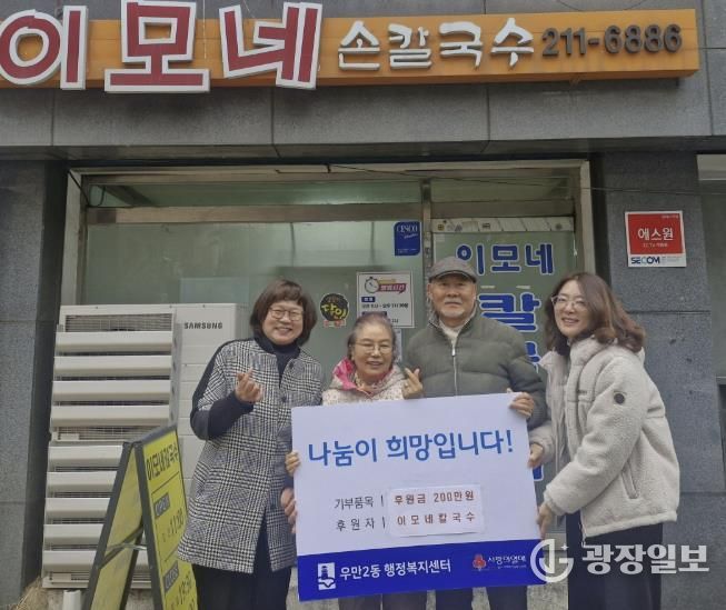 최영문 우만2동장은 “경기가 좋지 않음에도 해마다 후원을 이어오는 것이 결코 쉬운 일이 아니다”라며 “이모네칼국수의 따뜻한 나눔이 지역사회에 큰 울림을 주고 있으며, 홀몸어르신 복지 향상에 실질적인 도움이 되고 있다”고 감사의 뜻을 밝혔다.