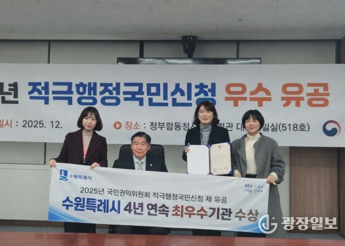 수원시는 24일 정부서울청사 정부합동민원센터에서 열린 2025 국민권익위원회 적극행정국민신청제 우수기관 시상식에서 상장을 받았다. 수원시는 적극행정국민신청제가 도입된 2022년부터 올해까지 4년 연속 우수기관으로 선정되는 성과를 거뒀다.