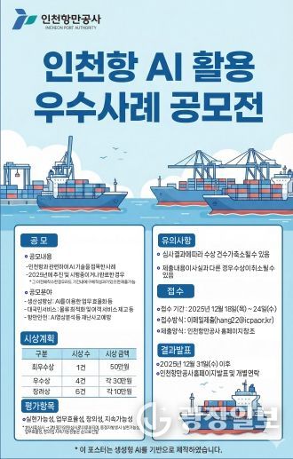 광장일보 주재영 기자 | 인천항만공사(사장 이경규, 이하 인천항만공사)는'2025년 인천항 혁신을 위한 AI 활용 우수사례 공모전'을 개최한다고 밝혔다.