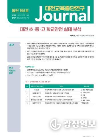 광장일보 이현나 기자 | 대전교육과학연구원 대전교육정책연구소는 2025년 대전교육종단연구저널 제5호'대전 초·중·고 학교안전 실태 분석', 제6호 '대전 교육가족의 정신건강 현황 분석'을 발간하여 대전 모든 기관 및 전국 교육정책연구소에 안내하고, 대전교육과학연구원 누리집에 공개했다고 밝혔다.