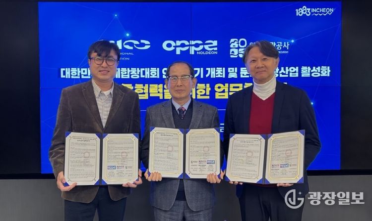 광장일보 주재영 기자 | 인천관광공사(사장 유지상)와 대한민국국제합창대회 조직위원회(위원장 김희철), ㈜놀던오빠들(대표 김준호)은 26일 인천관광공사에서 ‘대한민국국제합창대회 인천 개최(2026년~2030년) 및 문화관광 활성화’를 위한 업무협약을 체결했다.