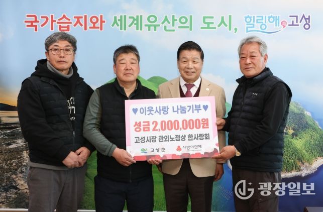 광장일보 주재영 기자 | 고성군은 12월 26일 고성시장 관외노점상 한사랑회(회장 전후동)에서 연말을 맞아 지역 내 어려운 이웃을 위해 성금 200만 원을 기탁했다고 밝혔다.