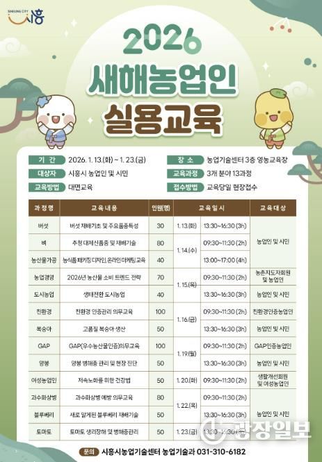 광장일보 이현나 기자 | 시흥시는 농업인의 전문역량 강화와 안정적인 영농 활동을 지원하기 위해 ‘2026년 새해농업인 실용교육’을 오는 1월 13일부터 23일까지 시흥시농업기술센터 3층 영농교육장에서 운영한다.