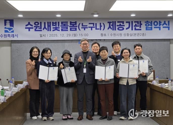 광장일보 나학천 기자 | 수원특례시이 29일 시청 상황실에서 ‘수원새빛돌봄(누구나) 서비스 제공기관 재협약 협약식’을 열고, 서비스 제공기관들과 재협약을 체결했다.