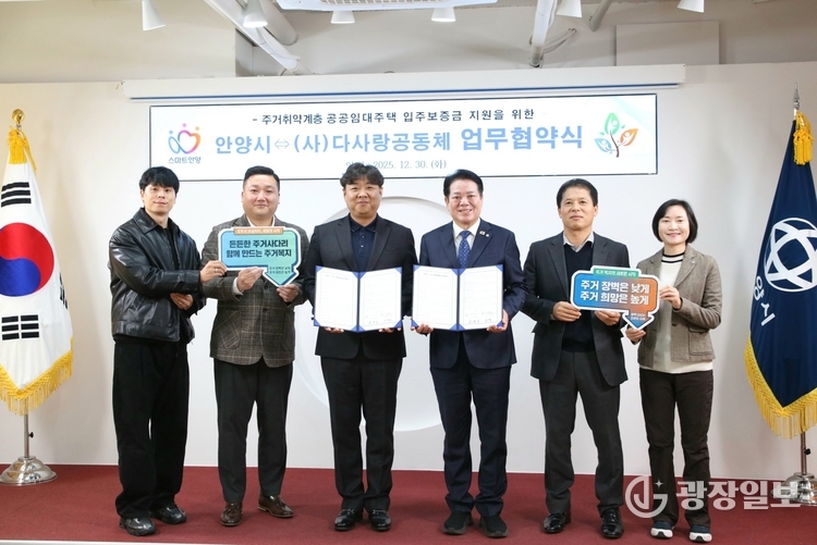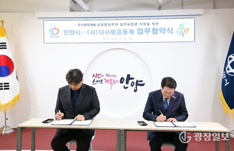 안양시= 주재영 기자 | 안양시(시장 최대호)는 30일 시청에서 다사랑공동체와 ‘주거취약계층 공공임대주택 입주보증금 지원’을 위한 업무협약을 체결했다.