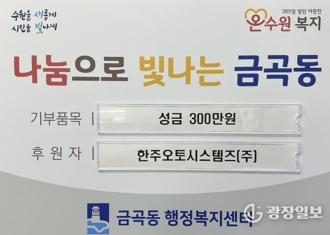 광장일보 나학천 기자 | 지난 29일 수원시 권선구 금곡동 행정복지센터는 한주오토시스템즈(주)로부터 저소득 가정을 지원하기 위한 성금 300만 원을 전달받았다고 밝혔다.
