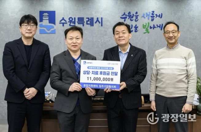 광장일보 나학천 기자 | 수원시 창업지원센터 입주기업협의회가 “학대 피해아동 지원에 사용해 달라”며 수원시에 후원금 1100만 원을 전달했다. 전달식은 30일 이재준 수원시장 집무실에서 열렸다.