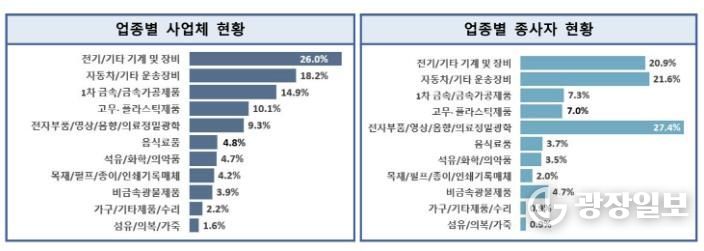 조사 결과, 아산시 제조업은 ‘전기/기타 기계 및 장비업’이 26.0%로 가장 높은 비중을 차지했다. 종사자 기준으로는 ‘전자부품/영상/음향/의료정밀광학업’이 27.4%로 가장 많았다.