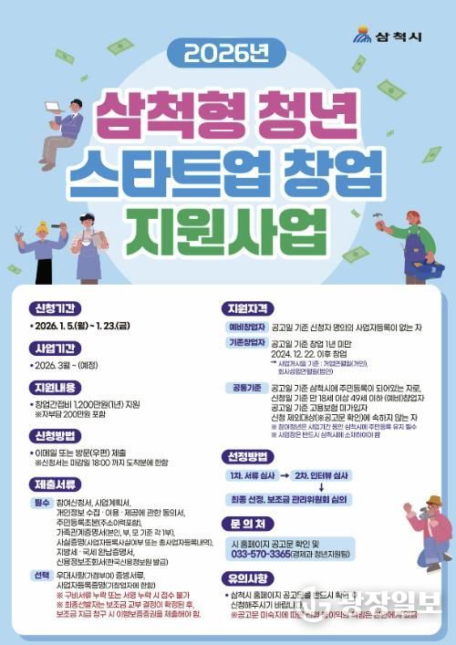 광장일보 이현나 기자 | 삼척시가 혁신적인 창업 아이디어를 보유한 청년들의 창업 도전을 지원하기 위해 '2026년 삼척형 청년 스타트업 창업 지원사업' 참여자를 모집한다고 밝혔다.
