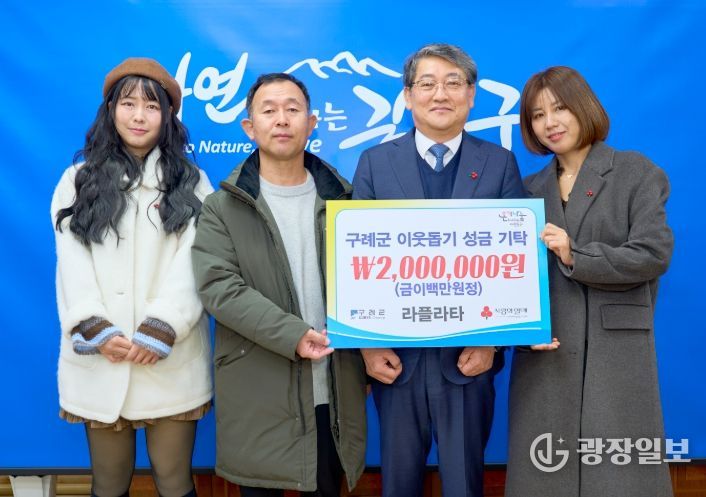 김순호 구례군수는 “해마다 변함없이 이웃사랑을 실천해 주시는 라플라타 김미라 대표님께 깊이 감사드린다”며 “이러한 따뜻한 나눔이 지역사회 전반에 희망을 전하는 큰 힘이 되고 있다”고 말했다.