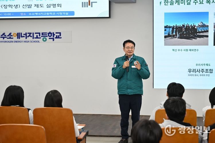 광장일보 주재영 기자 | 완주군의회 김재천 부의장이 지난 24일 수소에너지고등학교에서 실시된 채용 후보자(장학생) 선발 제도 설명회에 참석해 수소고등학교 학생들을 격려하고, 수소에너지고등학교 교장과 한솔케미칼 관계자 등과 함께 취업 연계방안에 대해 논의를 이어갔다.