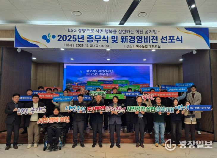 광장일보 주재영 기자 | 여수시도시관리공단은 31일 공단 대회의실에서 ‘新 경영비전 선포식’을 개최하고, 향후 5년간 공단이 나아갈 새로운 경영 철학과 조직 혁신 의지를 대내외에 공식적으로 밝혔다.