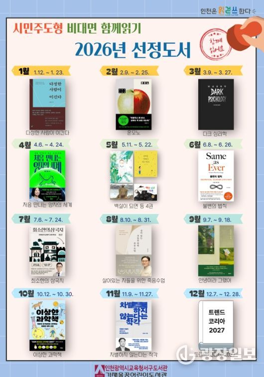 광장일보 주재영 기자 | 인천광역시교육청서구도서관은 12월 31일 ‘2026년 시민주도형 비대면 함께읽기’ 도서 15권을 선정·발표했다.