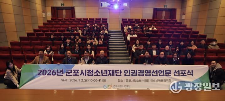 시무식에서는 김덕희 대표이사의 신년 인사말씀을 시작으로, 재단의 경영 철학과 가치 실현 의지를 담은 군포시청소년재단 인권·경영 선언문 선포식이 진행됐다. 이를 통해 재단은 인권 존중을 기반으로 한 책임 있는 경영과 청소년 중심의 공공기관 운영 의지를 공식화했다.