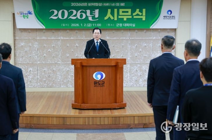 광장일보 주재영 기자 | 신우철 완도군수는 2일 시무식에서 올해의 화두를 ‘힘차게 도약하여 왕성하게 번창한다’는 뜻의 ‘비약창성(飛躍昌盛)’으로 정하고 그동안 쌓아온 성과를 토대로 도약을 이룩하겠다는 포부를 밝혔다.