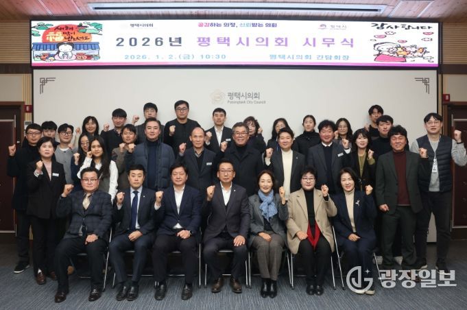 광장일보 주재영 기자 | 평택시의회는 2일, 시의회 간담회장에서 의원 및 의회사무국 직원 등 60여 명이 참석한 가운데 2026년 시무식을 가졌다.