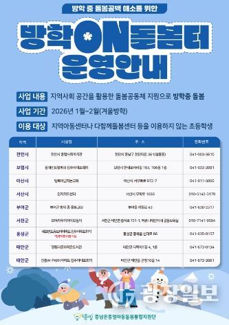 광장일보 주재영 기자 | 충남사회서비스원은 1월 2일부터 겨울방학 기간 동안 돌봄이 필요한 아동을 위해 방학ON돌봄터를 발굴하여 운영을 지원한다.