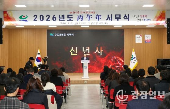 광장일보 주재영 기자 | 고성군은 1월 2일, 군청 5층 대회의실에서 2026년도 시무식을 열고 새해 군정 운영의 힘찬 출발을 알렸다. 이날 시무식은 국민의례를 시작으로 반부패·청렴 선서, 시상, 군수 신년사, 직원과의 신년인사 순으로 진행됐다.