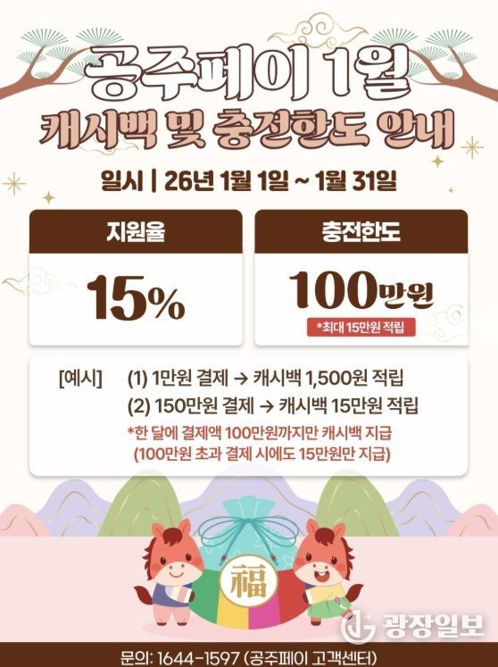 이에 따라 충전 시기와 관계없이 월 100만 원 한도 내에서 공주페이로 결제한 금액의 15%가 환급금으로 제공된다. 이용자는 한 달에 최대 15만 원까지 혜택을 받을 수 있다.