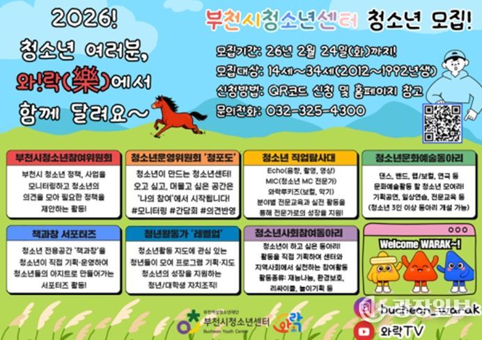 광장일보 주재영 기자 | 부천여성청소년재단이 운영하는 부천시청소년센터는 2026년 청소년 참여자치조직 및 동아리 활동에 참여할 청소년·청년을 모집한다. 부천시청소년센터는 청소년의 자치 역량 강화와 주도적 참여 확대를 위해 참여, 문화예술, 진로직업탐색 등 다양한 활동을 운영하고 있다.