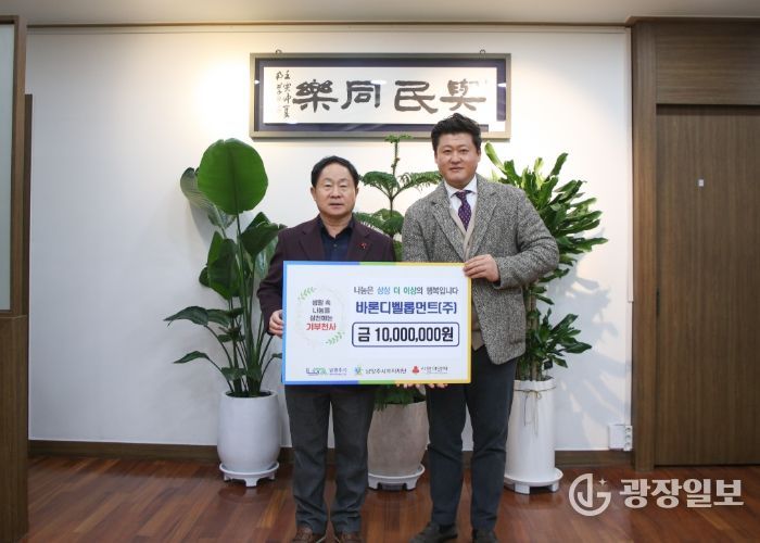 광장일보 주재영 기자 | 남양주시는 5일 바른디벨롭먼트 주식회사가 지역 내 취약계층 지원을 위해 후원금 1천만 원을 남양주시복지재단에 기탁했다고 밝혔다.