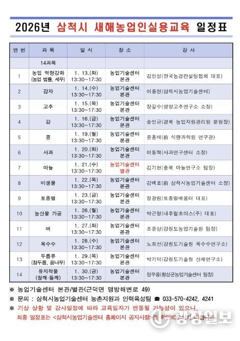 광장일보 이현나 기자 | 삼척시는 오는 1월 13일부터 1월 30일까지 지역 농업인 1,000여 명을 대상으로 ‘2026년 새해농업인실용교육’을 실시한다.