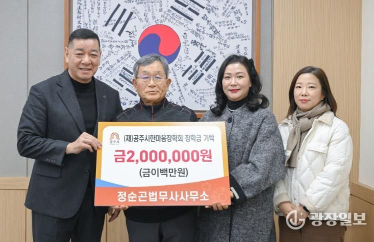 광장일보 주재영 기자 | 정순곤법무사사무소는 지난 6일 (재)공주시한마음장학회에 가정형편이 어려운 학생들을 위한 장학금 200만 원을 기탁했다.