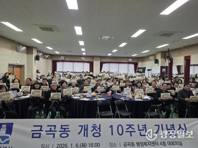 광장일보 나학천 기자 | 2026년 개청 10주년을 맞은 권선구 금곡동은 지난 6일 지역구 의원과 주민 등 100여 명이 참석한 가운데 주민자치회 및 통장협의회와 함께 10주년 기념행사를 개최했다.