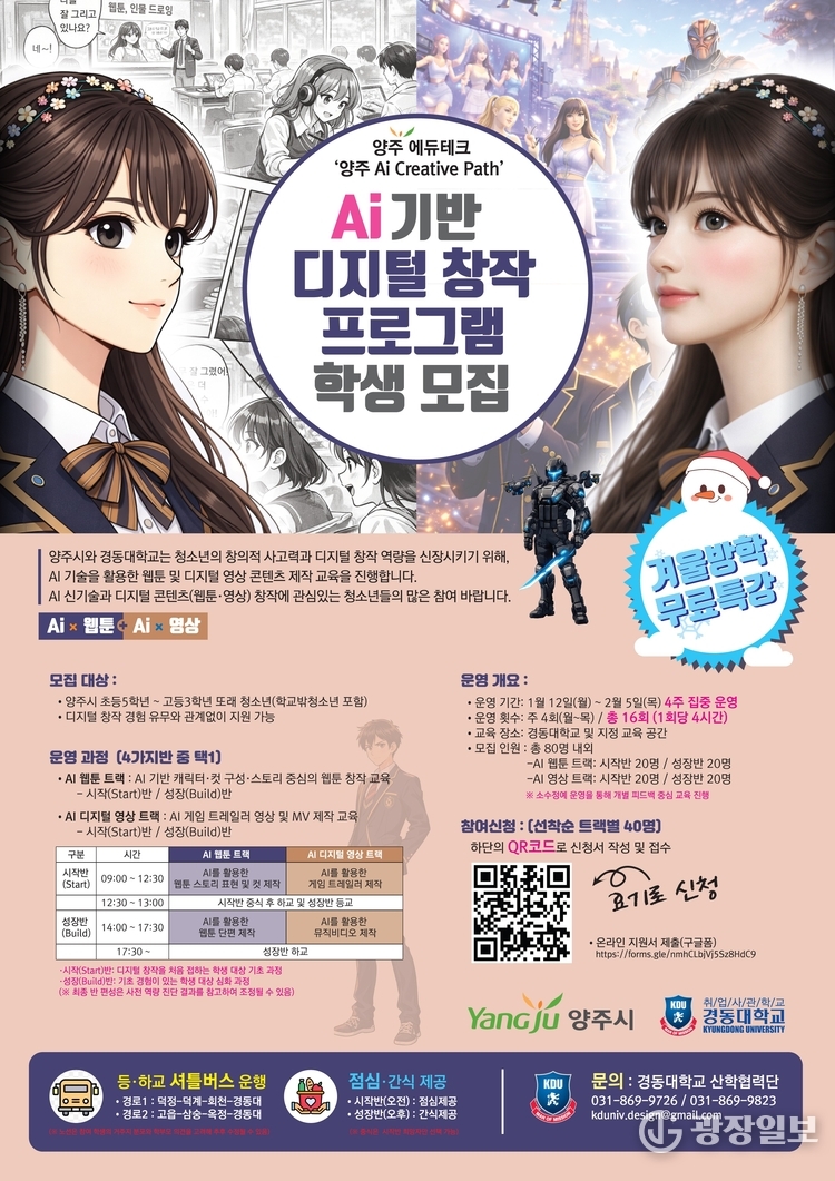 양주시= 주재영 기자 |양주시는 교육발전특구 사업의 일환으로 오는 12일부터 경동대학교와 함께 인공지능(AI) 기술을 활용한 디지털 콘텐츠 제작 교육 프로그램을 운영하고 참여 학생을 모집한다고 밝혔다.