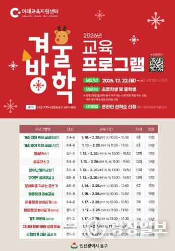 광장일보 주재영 기자 | 인천 동구 미래교육지원센터는 1월 10일~2월 28일까지 관내 초·중학생을 대상으로 겨울방학 교육 프로그램을 운영한다고 밝혔다.