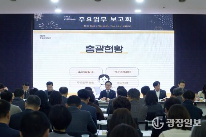 광장일보 주재영 기자 | 천안시는 7일 시청 대회의실에서 ‘2026 주요업무 보고회’를 열고 도시 경쟁력 강화를 위한 주요 정책 방향을 논의했다.