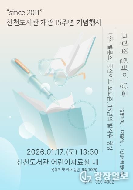광장일보 이현나 기자 | 시흥시는 오는 1월 17일 신천도서관에서 ‘개관 15주년 기념행사’를 열고, 유아동 및 어린이 동반 가족 100여 명을 대상으로 그림책 낭독과 마술 공연을 운영한다. 행사는 이날 오후 1시 30분부터 3시 30분까지 진행된다.