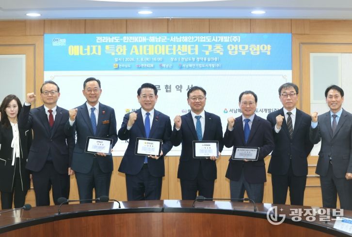해남군은 8일 전남도-한전KDN-서남해안기업도시개발(주)와 에너지특화 AI데이터센터 구축을 위한 업무협약을 체결했다.