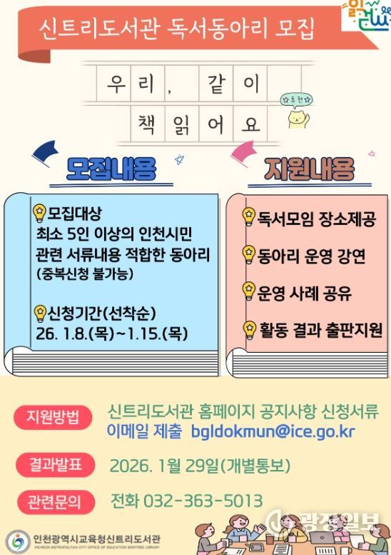 광장일보 주재영 기자 | 인천광역시교육청신트리도서관은 시민 주도의 자율적인 독서 활동을 지원하고 생활 속 독서문화를 확산하기 위해 '2026년 자율독서동아리 지원사업'의 동아리를 모집한다.