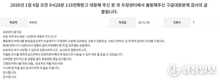 환자의 보호자는 천안서북소방서 칭찬게시판을 통해 “경황이 없는 상황에서 보호자인 제가 차분해질 수 있도록 안정시켜 주시고, 순서 있게 질문해 주셔서 적절한 조치를 할 수 있었다”며 “덕분에 어머니를 빠르게 병원으로 이송해 치료를 받을 수 있었다”고 깊은 감사의 뜻을 전했다.