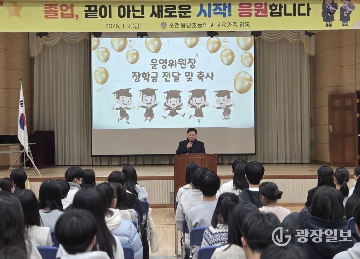 김 위원장은 이날 축사를 통해 “졸업생 여러분은 순천용당초등학교에서 배움의 기쁨과 친구의 소중함, 그리고 서로를 존중하고 배려하는 마음을 배웠다”라며 “이 경험은 앞으로 어떤 길을 가든 여러분을 바르게 이끌어 줄 평생의 자산이 될 것”이라고 말했다.