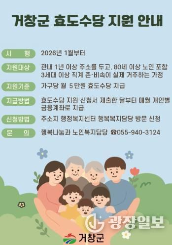 광장일보 주재영 기자 | 거창군은 경로효친의 건전한 가족제도 정착과 효 문화 확산을 위해 효도수당 지원 대상을 확대하고, 2026년 1월부터 본격 지급에 나선다.