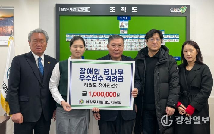 이날 행사에서 손기남 남양주시장애인체육회 수석부회장이 장애인태권도 국가대표 정아인 선수에게 직접 격려금을 전달했다. 전달식에는 윤성한 남양주시장애인태권도협회장을 비롯한 관계자와 선수 가족이 함께 참석해 의미를 더했다.