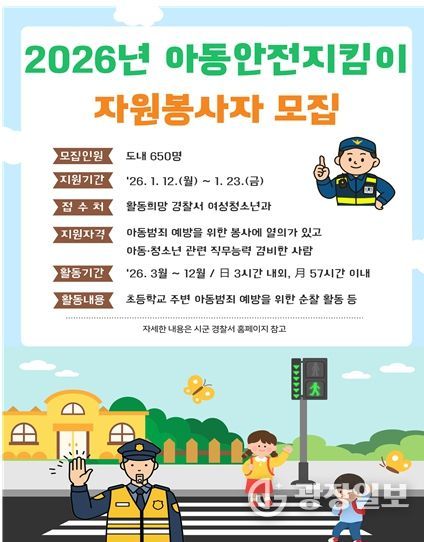 광장일보 이현나 기자 | 강원자치경찰위원회와 강원경찰청은 아동 대상 범죄 예방을 위해 ‘2026년 아동안전지킴이 자원봉사자’를 선발·모집한다.