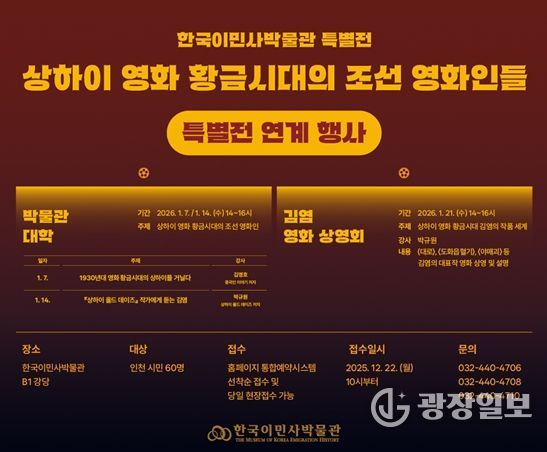 광장일보 주재영 기자 | 인천광역시 시립박물관 분관 한국이민사박물관은 특별전 〈상하이 영화 황금시대의 조선 영화인들〉과 연계해 『상하이 올드 데이즈』의 저자 박규원 작가를 초청한 특강을 개최한다.