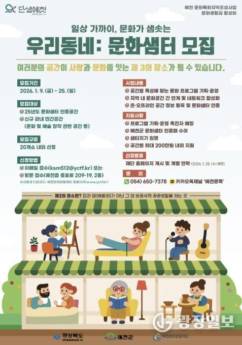 광장일보 주재영 기자 | 예천군과 (재)예천문화관광재단은 ‘문화특화지역 조성사업’의 일환으로 문화생활권 조성을 위한 ‘우리동네:문화샘터’ 2기 참여자를 9일부터 25일까지 모집한다.