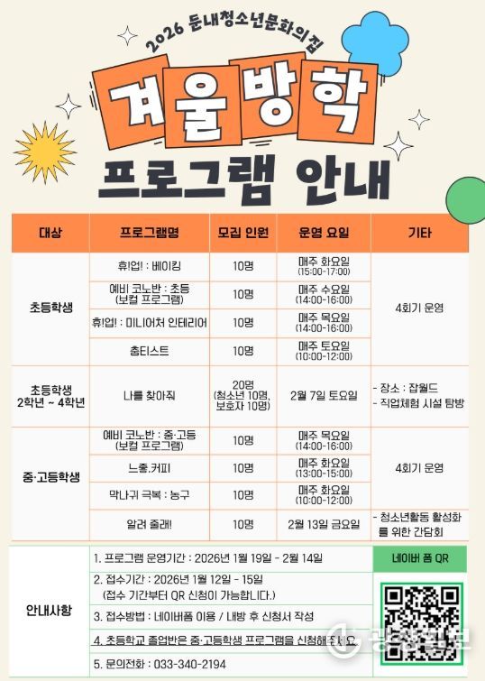 광장일보 이현나 기자 | 둔내청소년문화의집이 다가오는 겨울방학을 맞아 지역 청소년들의 소질 계발과 유익한 여가 선용을 위한 ‘2026년 겨울방학 프로그램’ 수강생을 모집한다.