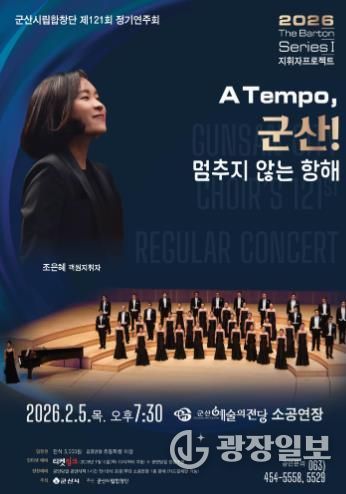 광장일보 주재영 기자 | 군산시립합창단이 제121회 정기연주회 〈2026 The Barton Series Ⅰ 지휘자 프로젝트〉 A Tempo, 군산! '멈추지 않는 항해'를 오는 2월 5일 저녁 7시 30분, 군산예술의전당 소공연장에서 개최한다.