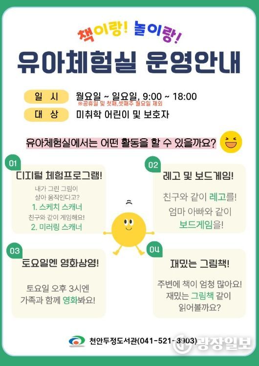광장일보 주재영 기자 | 천안시 두정도서관은 미취학 아동을 위한 ‘놀이 기반 독서 환경’인 유아체험실을 운영해 주민들로부터 호응을 얻고 있다고 12일 밝혔다.