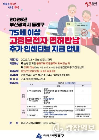 광장일보 주재영 기자 | 부산 동래구는 고령 운전자 교통사고를 예방하고 안전한 교통 환경을 조성하기 위해 2026년부터 ‘고령 운전자 운전면허 자진 반납 추가 인센티브 지급 사업’을 추진한다고 밝혔다.